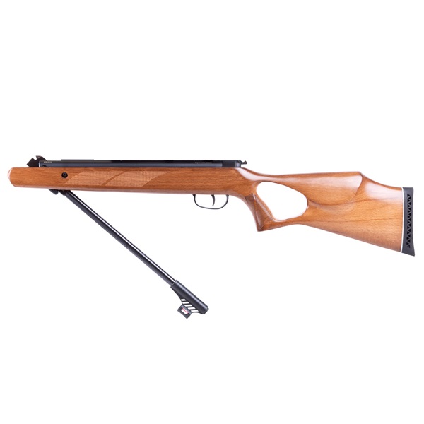 Este modelo possui um design muito confortável e moderno, com coronha em madeira de faia de alta qualidade, funciona mecanicamente com mola, sistema simples e de confiabilidade comprovada, miras abertas de fibra óptica com ajuste micrométrico.
