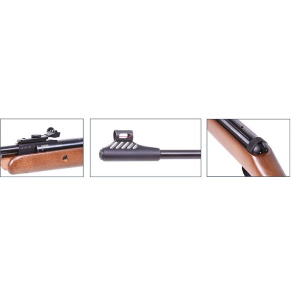 DIANA TWO-FORTY 4,5 mm. Carabina de pressão de mola de cano dividido com coronha de madeira de boa qualidade. Possui segurança automática e miras TRUGLO ajustáveis. O inclinoscópio ajusta em altura e direção. Na parte traseira da coronha há uma peça de bochecha ambidestra e tem um pé para absorção de choque. Possui uma base de 9-11 mm para um suporte de dioptria e seu cano é nervurado. A DIANA TWO-FORTY 4,5 mm é uma carabina de pressão para entusiastas de tiro (jovens e velhos) e a um preço muito acessível.