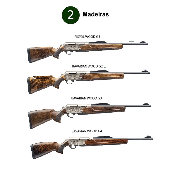 A partir de agora, você pode configurar a sua carabina BAR 4X escolhendo sua gravação, mas também o grau das madeira e aparelhos de pontaria . Escolha entre 4 gravuras, 2 em preto e 2 em moldura niquelada e 5 referências de coronha de madeira, coronha de pistola nos graus 2 e 3 ou coronha bávara nos graus 2, 3 e 4.
