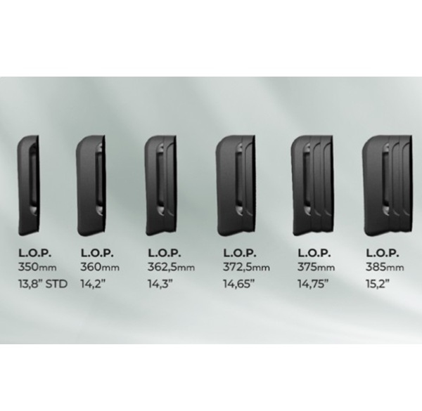 Uma das características verdadeiramente únicas da LUPO é a capacidade de ajustar o alcance do gatilho, o lançamento e o alcance do gatilho com calços inclusos. Os atiradores podem obter um ajuste personalizado pronto para uso, sem a necessidade de trabalhos caros de armeiro. Os calços permitem que a coronha seja ajustada em uma das 36 posições diferentes. As opções de ajuste opcionais incluem dois estilos de almofadas de bochecha elevadas e uma almofada de coronha com comprimento opcional. Um ótimo ajuste significa melhor controle... e maior precisão.