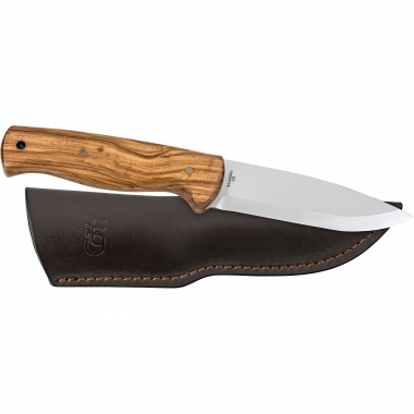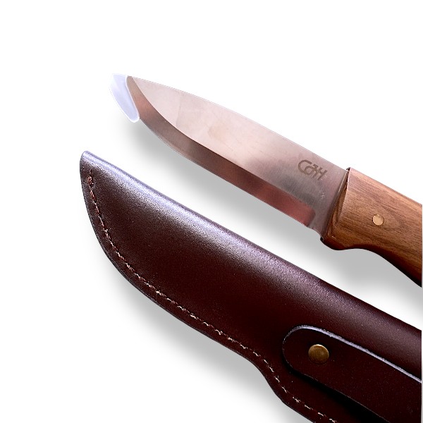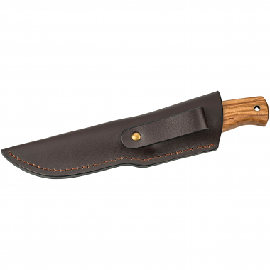 • Com cabo de madeira de oliveira e bainha de couro.