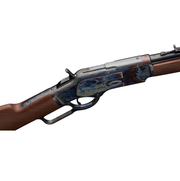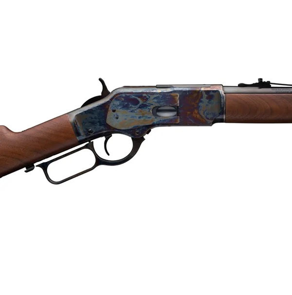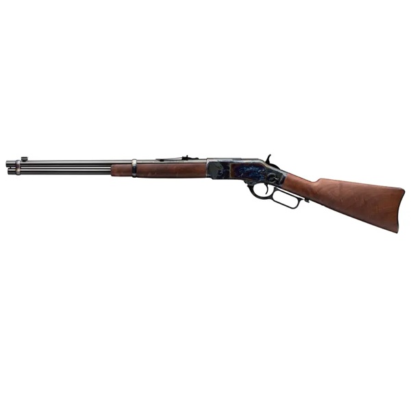 Configuração de carabina de competição do rifle de ação de alavanca Modelo 1873, com faixa de cano, coronha reforçada com revestimento colorido, anel de sela e coronha de nogueira. Perfurada/rosqueada para uma mira peep opcional montada no receptor.