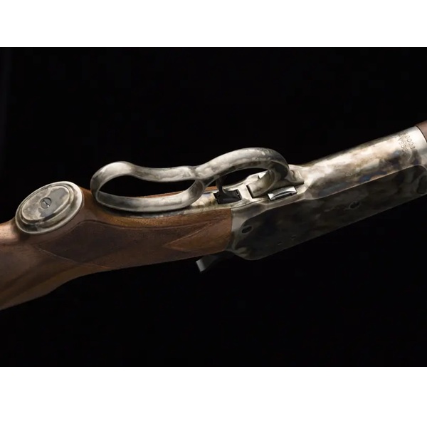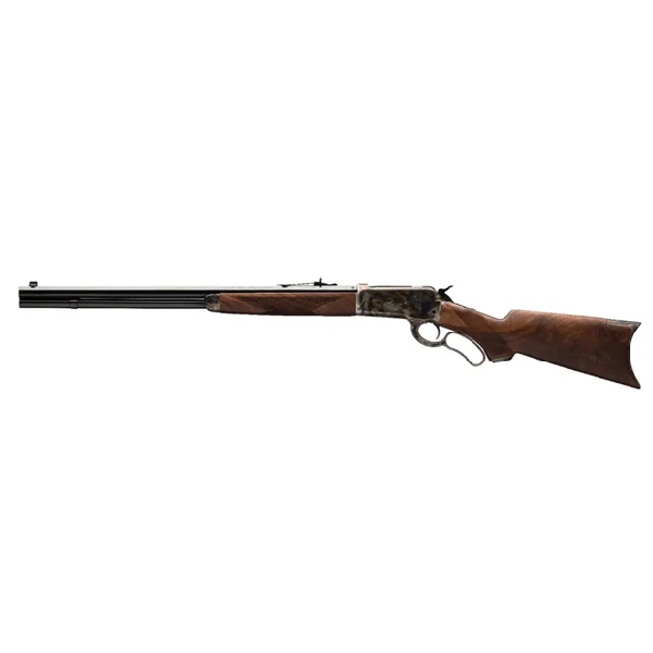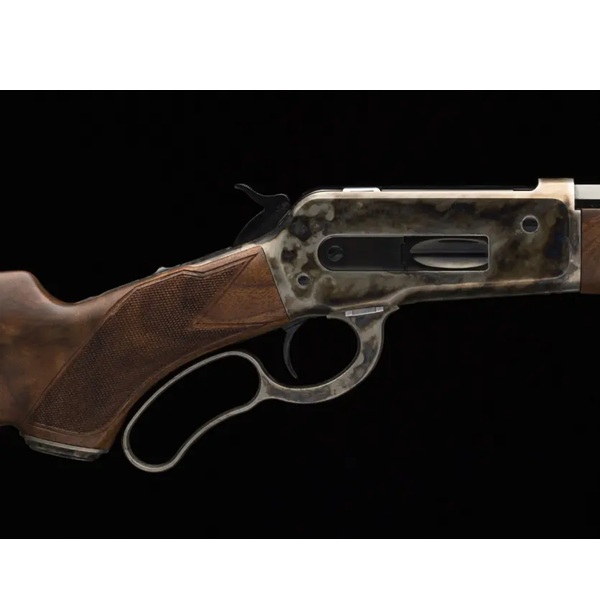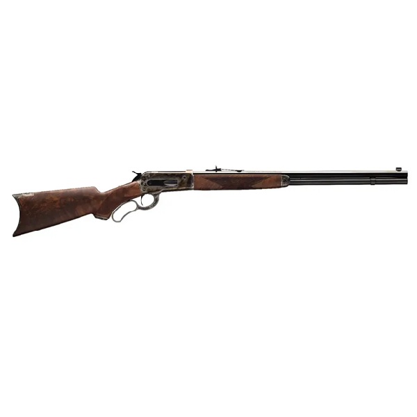 Carabina modelo 1886 de ação por alavanca de alta qualidade, com câmara para potentes cartuchos históricos. Receptor, alavanca, tampa do antebraço e coronha em forma de crescente, temperados em caixa colorida. Cano octogonal azulado de 24". Coronha e antebraço curvos em nogueira quadriculada com acabamento acetinado de alta qualidade III/IV. Alça de mira frontal Marble Arms e alça de mira ajustável. Receptor com rosca para uma mira peep opcional.