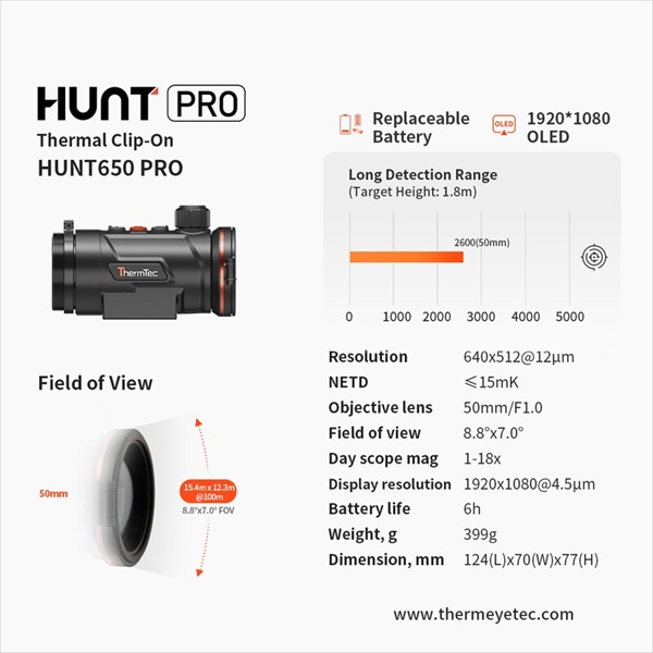 O Hunt 650 Pro da ThermTec estabelece novos padrões na tecnologia de imagem térmica. Este versátil dispositivo adicional, o Hunt 650 Pro, pode ser montado de forma rápida e fácil na sua mira diurna (adaptador disponível opcionalmente) e transforma a sua mira telescópica num potente aparelho de visão noturna. Perfeito para experiências de caça exigentes, o Hunt 650 Pro impressiona com uma excelente relação custo-benefício, um sensor de alta resolução de 640x512 pixels, uma lente de 50 mm com foco manual e foco inovador por roda giratória, sensibilidade ≤ 15 mK, uma impressionante distância de deteção de até 2600 metros, um campo de visão médio de aproximadamente 15,4 metros a 100 metros e um sistema de bateria substituível com até 12 horas de autonomia graças à bateria secundária incluída, que pode ser convenientemente carregada via USB-C.