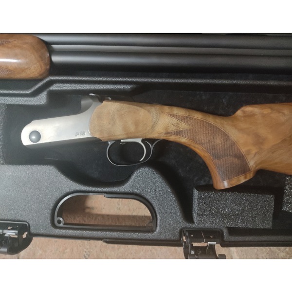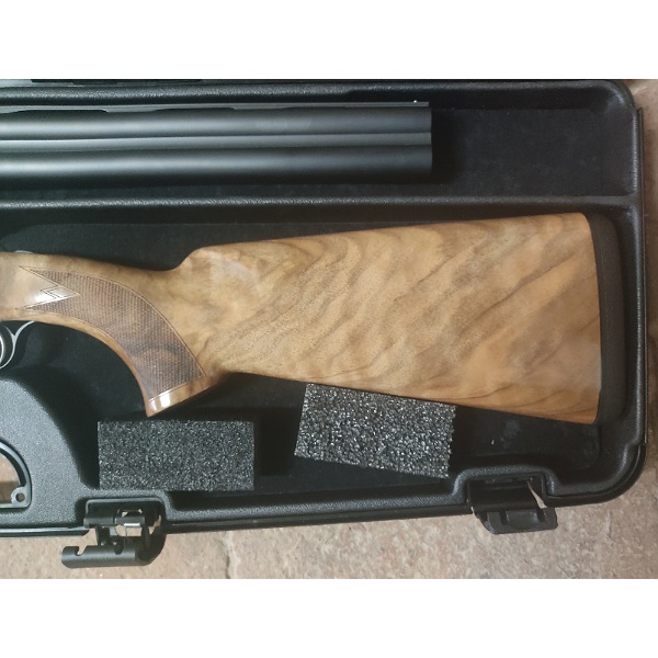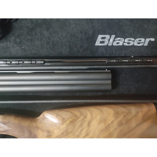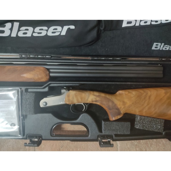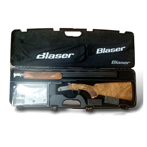 Dispone de báscula lisa, delantera inglesa, cantonera de goma Blaser, Confort Recoil. Recámara magnum (76 mm), gatillo muy suave, regulável em longitude en el