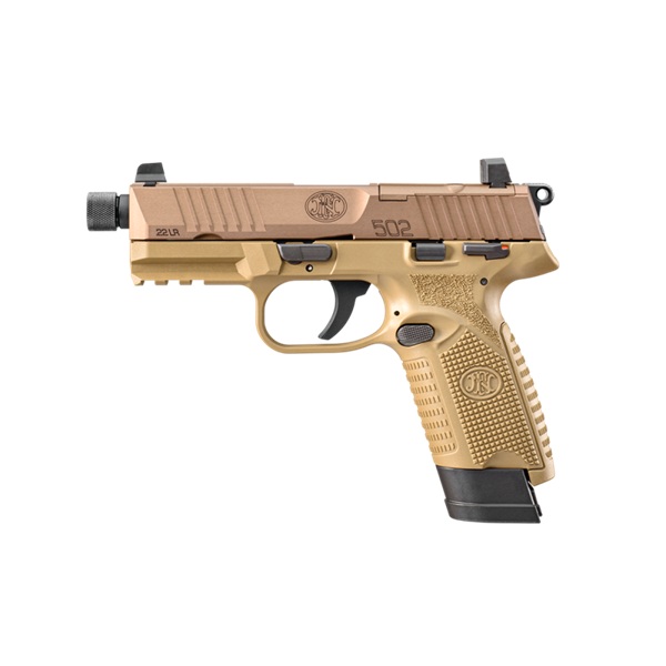 A FN 502 Tactical é anunciada como a primeira pistola com câmara para calibre .22 Long Rifle, pronta para mira, com montagem em ferrolho. A Umarex, na Alemanha, a fabrica para a FN. À primeira vista, você pode pensar que esta é a versão de fogo circular da FN de sua popular série de pistolas 509, mas isso seria incorreto. Embora sejam semelhantes em muitos aspectos e possam até compartilhar coldres, existem várias distinções importantes que tornam a FN 502 um produto independente. A mais óbvia delas é que a 502 Tactical é uma pistola de ação simples, com percussor, em vez de um design de ação dupla, com percussor, como sua prima de fogo central.